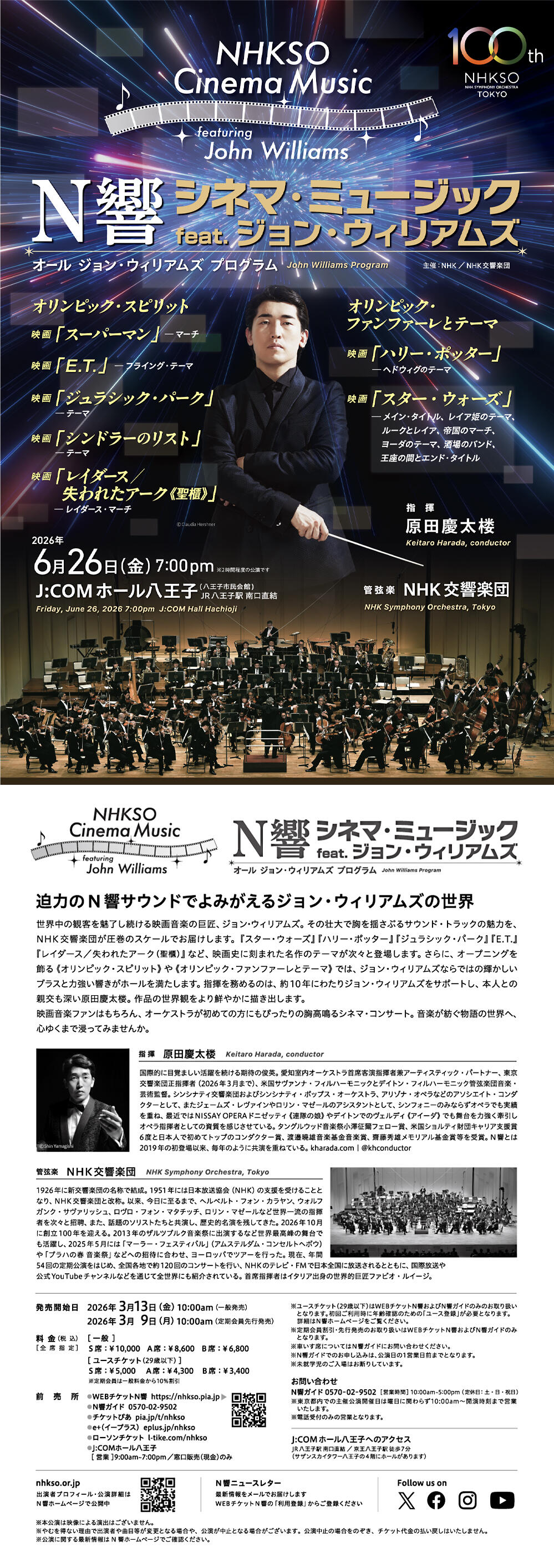 世界中の観客を魅了し続ける映画音楽の巨匠、ジョン・ウィリアムズ。その壮大で胸を揺さぶるサウンド・トラックの魅力を、NHK交響楽団が圧巻のスケールでお届けします。『スター・ウォーズ』『ハリー・ポッター』『ジュラシック・パーク』『E.T.』『レイダース/失われたアーク(聖櫃)』など、映画史に刻まれた名作のテーマが次々と登場します。さらに、オープニングを飾る《オリンピック・スピリット》や《オリンピック・ファンファーレとテーマ》では、ジョン・ウィリアムズならではの輝かしいブラスと力強い響きがホールを満たします。指揮を務めるのは、約10年にわたりジョン・ウィリアムズをサポートし、本人との親交も深い原田慶太楼。作品の世界観をより鮮やかに描き出します。