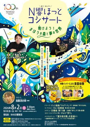 オーケストラの音が鳴ったそのしゅんかん、NHKホールは“まほうの森と夢の世界”に早変わり。今年で100才をむかえるN響のなかまたちと、正指揮者・下野竜也さんが案内するよ。