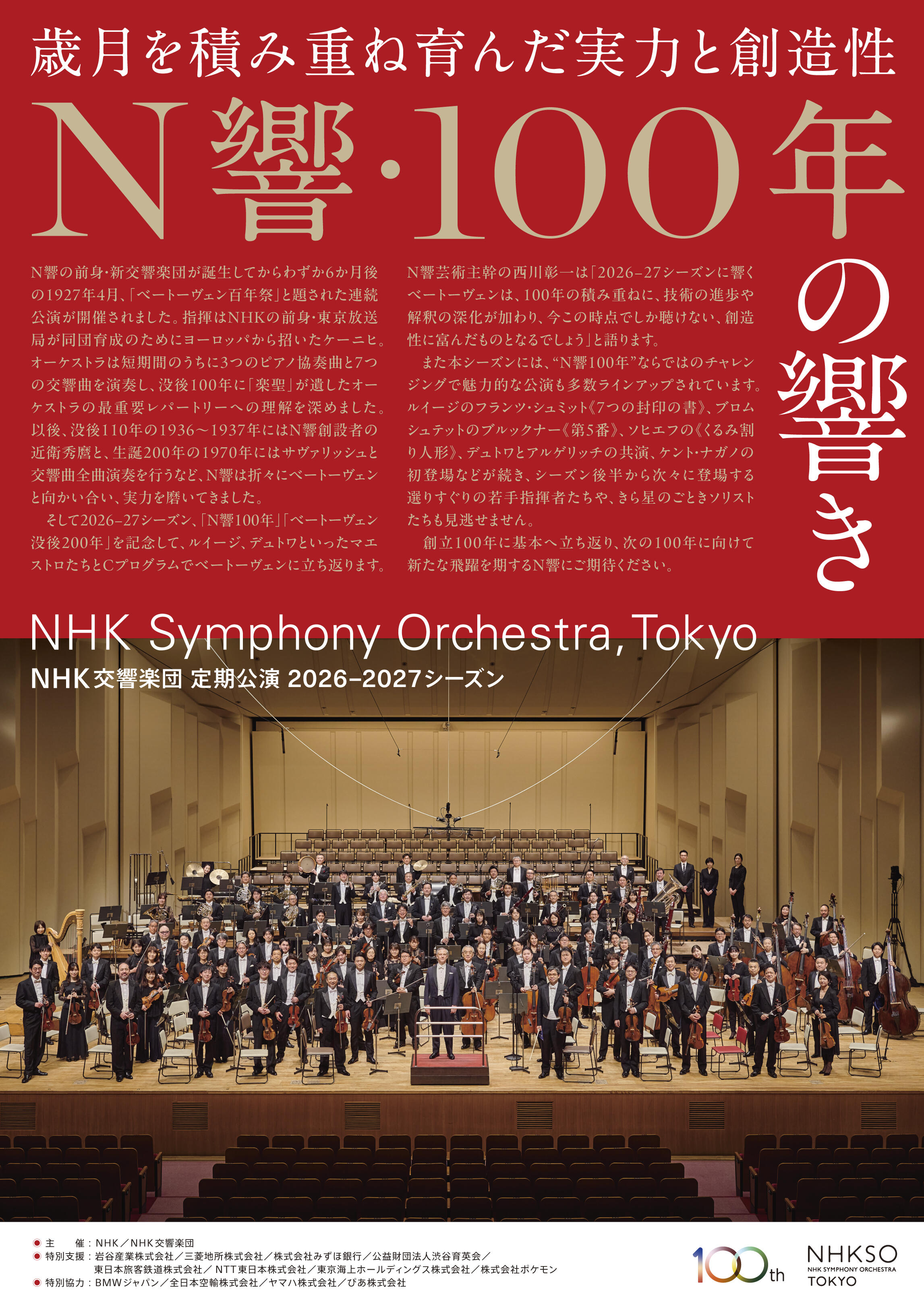 首席指揮者のファビオ・ルイージを中心に、国内外のクラシック音楽界をリードする幅広い世代の指揮者、ソリストたちが次々登場し、「N響100年」の節目にふさわしい充実したプログラムをお届けします。歴史と伝統に支えられながら進化し続けるN響に、引き続きご期待いただけましたら幸いです。